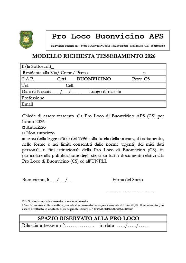 Quota di 20,00 euro comprensiva della tessera unica Pro Loco di Buonvicino APS e UNPLI